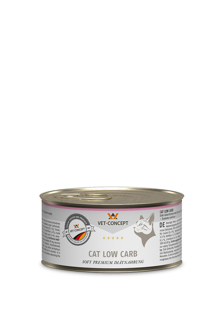 Cats with Diabetes mellitus have particular demands on their diet. A precisely balanced, tasty and carbohydrate-controlled diet can help achieve peak physical condition and contribute to regulating the glucose supply. CAT LOW CARB meets this requirement through the selection of high-quality meat components and the use of complex, slowly available carbohydrates such as pumpkin. The usual rise in blood sugar levels after a meal can thus be slowed down and a stabilisation of the diabetic patient achieved.